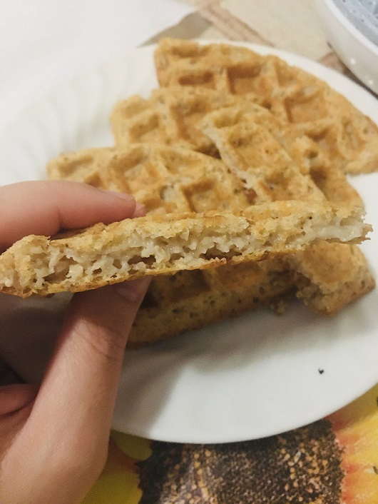 Mod de preparare: Puneti fulgii in robot și ii mărunțiti pana devin faina. Apoi adăugați in robot banana, iaurtul și uleiul de cocos. Acum e timpul sa adăugați praful de copt și lingura de faina de cocos. Când s-a omogenizat totul, puteți sa puneti aluatul in aparatul de gofre uns cu puțin ulei și neincalzit înainte. Cu aparatul meu, a fost necesar sa las mai multe cicluri de coacere pana gofrele au fost gata. Din compozitia aceasta ies 4 gofre mici sau cât lucrează aparatul o data. Sunt dulci, deși n-au zahar, crocante pe exterior și puțin, dar foarte puțin umede pe interior. Pofta mare!