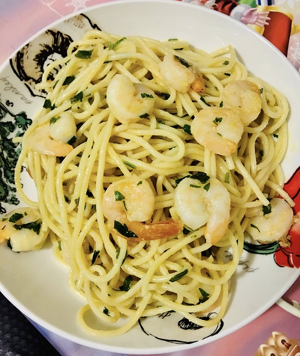 Mod de preparare: Pastele se fierb conform instrucțiunilor. Adăugați sare in apa și nu cumva sa puneti ulei, pentru ca nu va mai sta sosul pe ele. Creveții ii decongelati și ii puneti la foc iute in tigaia cu uleiul de măsline. Presărați sare și piper. Ii lăsați puțin, cât sa devină puțin albi și sa prindă putina crusta. Ii scoateți și puneti in tigaie usturoiul, amestecând rapid, ca sa nu devină auriu/maroniu, ca ne strica rețeta. Când usturoiul și-a lăsat aroma in tigaie turnam zeama de lămâie și vinul. Lămâie puneti in funcție de cât de acru mancati. Lăsați pe foc câteva minute pana iese alcoolul. Puneti crevetii și mai lăsați pe foc 1-2 min, nu mai mult ca altfel crevetii devin gumosi. Adaugati minunatii creveți cu sos peste spaghetele și asezonați cu pătrunjel proaspăt. Mmm ce miros in bucatarie, ce arome!!