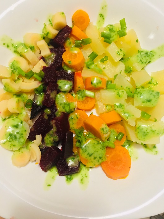 Legumele le-am fiert. Pătrunjelul l-am blenduit alături de ulei, 2 linguri din zeama in care au fiert legumele, zeama de lămâie și 2 pătrățele mici de cartof. A ieșit un sos bun, de am mâncat și eu același fel de mâncare. După de am taiat legumele si ceapa, le-am asezonat cu sosul Pesto. Acum, ca are introduse cu succes și nuciferele, ii adaug și 2 linguri de brânza vegana de caju. Pofta mare!