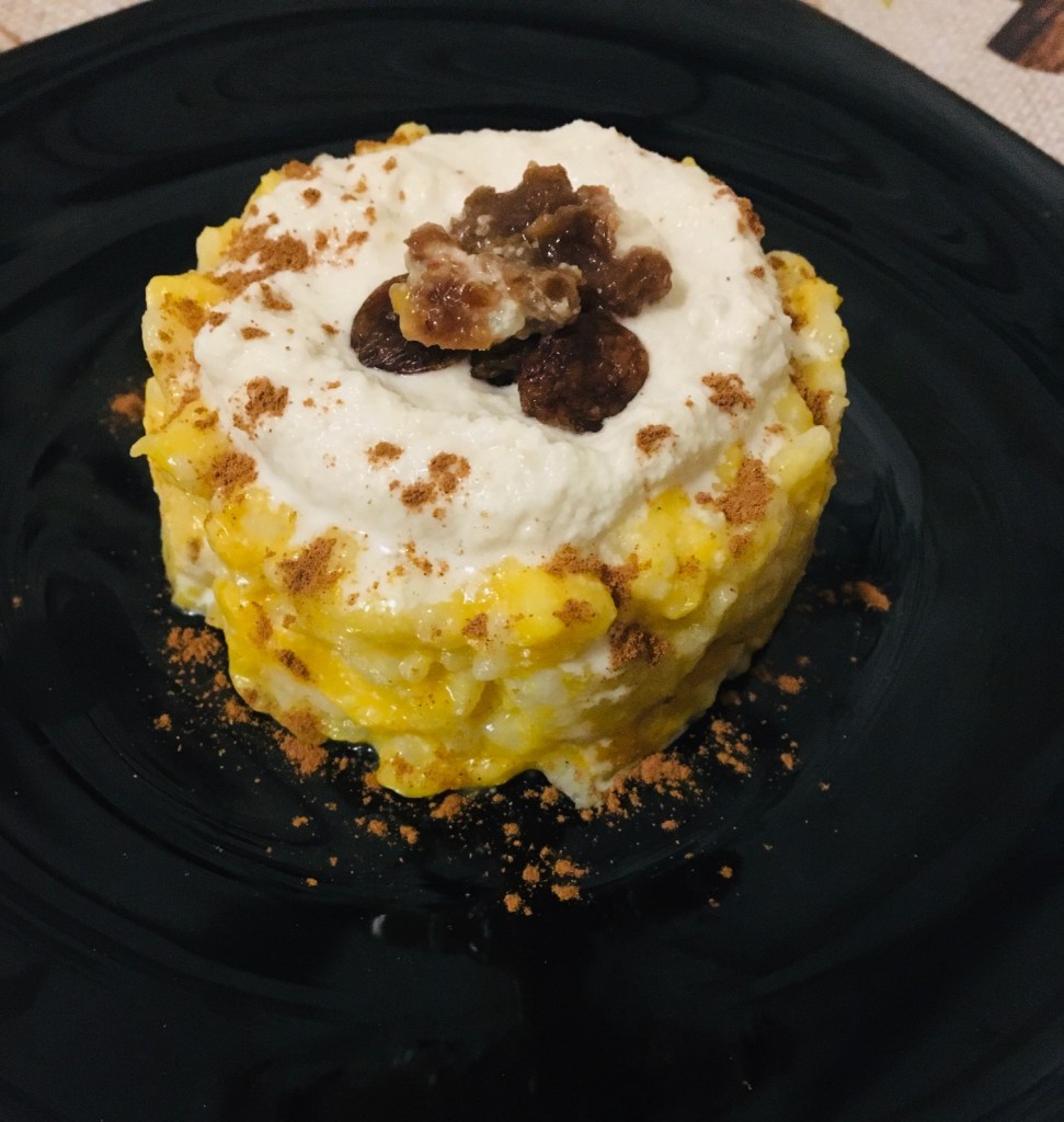 Orezul se fierbe conform instrucțiunilor de pe pachet. Eu pun 1 parte orez, 3 părți apa. Dovleacul se coace sau se fierbe la abur. Caju-ul hidratat și cu 3-4 linguri cu apa se face cu blenderul sau tocatorul electric pasta. La fel procedam și cu stafidele. Când dovleacul este gata, îl pasăm cu furculița și punem 1 lingura de ulei de cocos sau de care aveți vegetal. Peste el adaugati orezul, scortisoara și mierea. Ornați cu crema de caju și pasta de stafide. Delicios preparat! Încercați-l și-mi veți da dreptate.