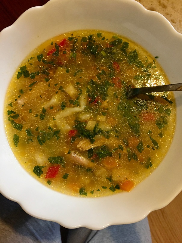 Mod de preparare: Curățăm pulpele de eventualii fulgi(eu mereu mereu ma uit și mereu găsesc). Le tăiem in doua(separam pulpa inferioară de cea superioara) și le lăsam 10 minute in apa cu putina sare ca sa iasă sângele din ele. Aruncam apoi apa și le punem la fiert in 3 l de apa. Le lăsam sa fiarba și adunam spuma care se strânge. După 20 de minute, scoatem pulpele, strecuram supa, schimbând oala sau punem supa intr-un castron mare, și spălam oala. Sângele și alte impurități veți vedea ca s-au strâns pe fundul și pereții oalei. Când avem oala curata și și supa strecurata o punem din nou pe foc și adăugăm toate legumele taiate. Eu carnea o dezosez, voi o puneti cum vreți înapoi in supa. Lăsam sa fiarba supa aproximativ 30 de minute, adăugând apa dacă mai este necesar.
