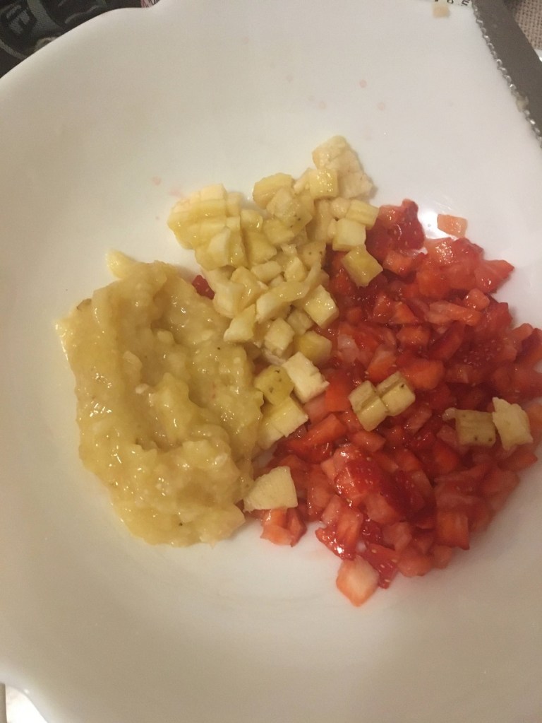 Maruntiti foarte fin fulgii de ovăz și fulgii quinoa, peste care turnati apoi iaurtul și faina de cocos. Lăsați compozitia sa se mai umfle, adică sa se hidrateze fainurile. Între timp va ocupati de fructe. 1/2 banana o pisați cu furculița, iar cealaltă jumătate o taiati cubulețe mici. Căpșunele le taiati și pe acestea, apoi împreuna cu banana le transferați in castronul cu faina și iaurt. Am ales sa nu pun vanilie sau alte arome și mirosuri, pentru ca fructele sunt suficient de aromate. Pregătiti cuptorul la 180 de grade. Compozitia de budinca o puneti in ce fel de forme doriți, dar pe care sa le ungeți cu ulei. Le băgați la cuptor pentru 40-45 de minute. Sa știți ca Budincile fierbinți sunt moi, însă când se răcesc își pastreaza forma. Pentru ca le-am făcut pentru prima data de Sfântul Nicolae, am făcut și un jeleu rapid, dar sa fiu sinceră, printul meu le-a preferat fără. Pofta mare!