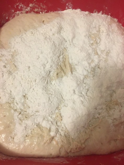 Dupa 30 de minute am verificat aluatul și acesta își dublase deja volumul, deci era gata. Acesta arata ca in poza atașata, deci foarte lipicios. Da, se lucrează puțin mai greu cu el, însă așa trebuie sa fie pentru a fi cozonacul pufos. Pregătiti blatul de lucru pe care presărați din belsug faina. Puneti putina faina peste aluatul din castron și transferați-l pe blatul de lucru. Frământați-l usor cu mâinile date prin faina, aplatizati-l usor pentru a mai sparge din bulele mari. Împărțiți aluatul in jumătate. O jumătate o puneti in castron, iar pe cealaltă începeți sa o întindeti cu sucitorul. Nu uitati, presărați faina ca acesta sa nu se lipească de blat, de mâini și de sucitor. Când ați reușit sa-l întindeti intr-o grosime cât degetul, și lung cât tava in care îl veți coace, începeți sa puneti umplutura.