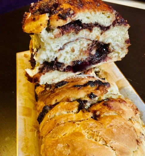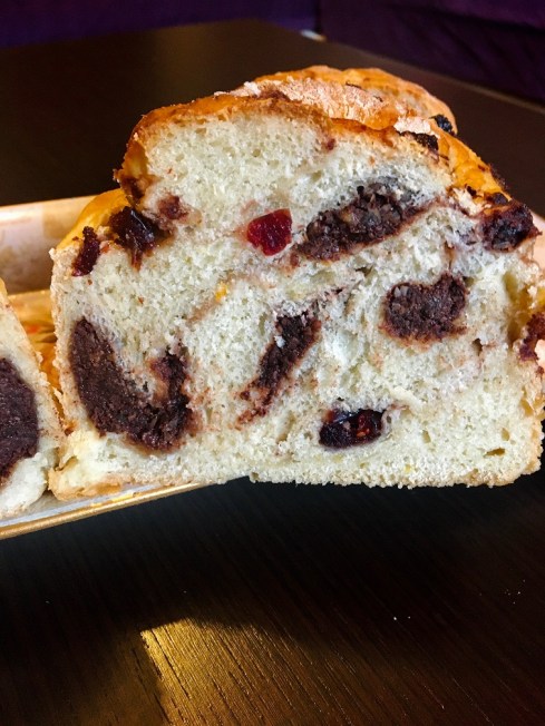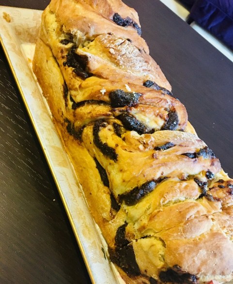 Repartizați uniform umplutura și presărați fructele confiate/uscate. Începeți sa rulați. Sigilați capetele și cu un cuțit ascuțit taiati rulada astfel formată, in doua bucăți pe lung. Așezati Jumătățile de rulada cu partea cu umplutura orientata in sus(pentru a nu se scurge umplutura). Începeți cu grija sa împletiți cele 2 jumătăți, întodeauna partea cu umplutura sa fie orientata in sus. Când ați format cozonacul, îl transferați cu grija in forma de cozonac tapetata cu ulei și faina. Procedați la fel și cu cealaltă jumătate de aluat.