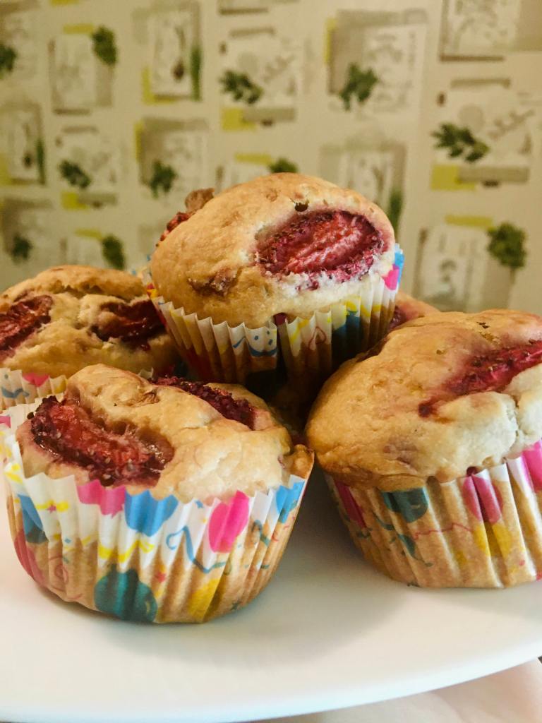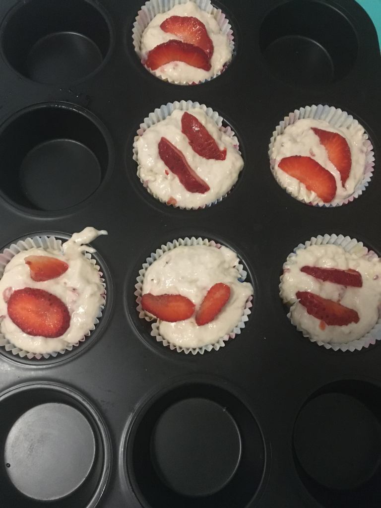 Amestecați faina și praful de copt. Pisați banana, răzuiți 2 căpșune și amestecați-le cu uleiul, apa și siropul (dacă puneti). Apoi, amestecați Ingredientele uscate cu cele lichide. Portionati in brioșe compozitia și puneti deasupra lor feliuțe de căpșuna. Preîncălziti cuptorul la 180 de grade Celsius și lăsați briosele sa se coacă aproximativ 45 de minute sau pana când vedeți ca s-au rumenit. Pofta mare!