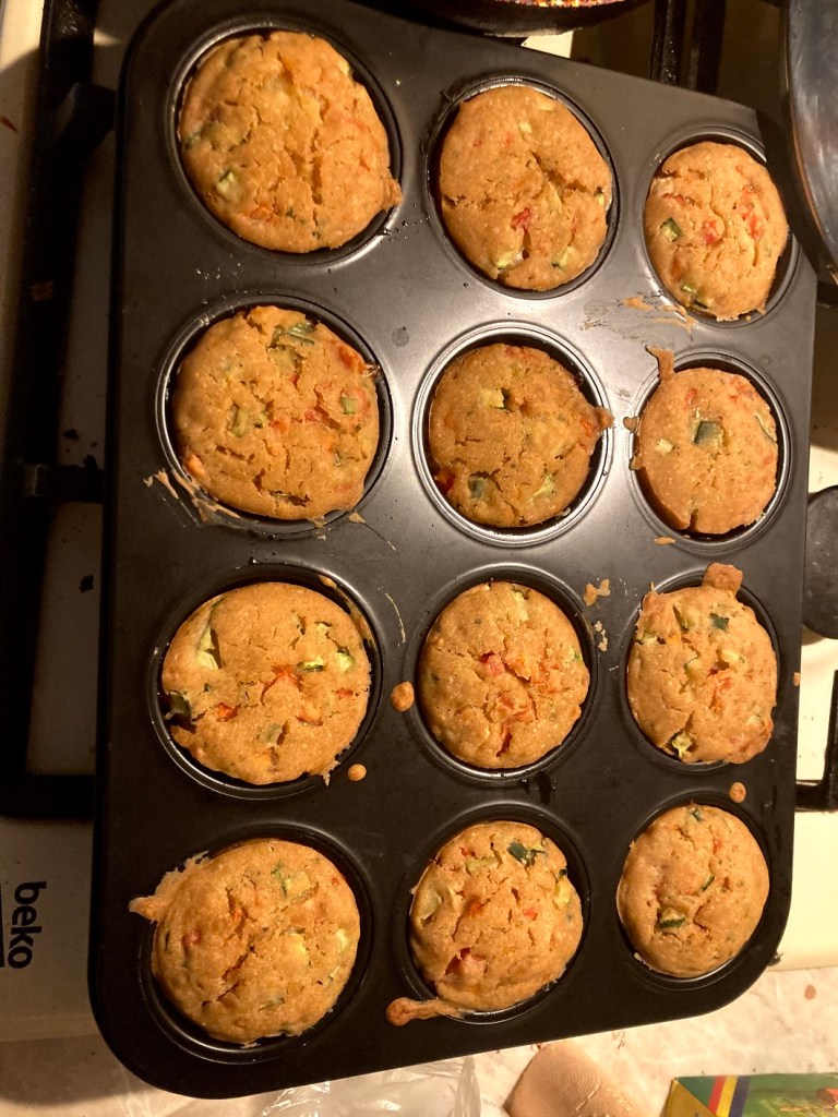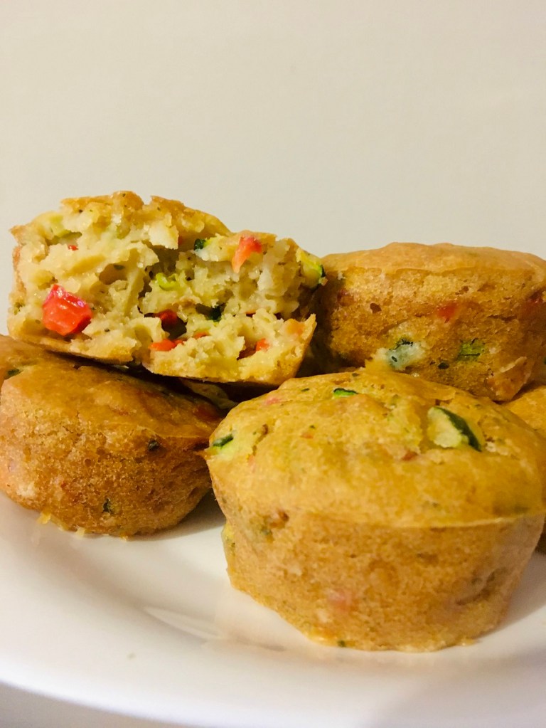 Se spala și se taie legumele cubulețe mici, peste care puneti putina sare și le lăsați intr-o sita la scurs. Pentru aluat, puneti intr-un castron încăpător apa/laptele vegetal, uleiul, sarea și condimentele. Amestecați și puneti treptat faina, amestecând bine sa nu se formeze cocoloașe. Iese o compoziție moale și lipicioasa, dar groasa nu ca cea de clătite. Puneti praful de copt și bicarbonatul, amestecați și apoi puneti zeama de lămâie. Scurgeți legumele bine și le adaugati și pe acestea in compoziție. Puneti intr-o forma de brioșe compoziția și dați tava la cuptor pentru 45-50 de minute(pana se rumenesc frumos) la 180 de grade Celsius. Cuptorul sa fie preîncălzit. Ies niște super brioșe, deloc înecăcioase. Este necesar ca legumele sa fie bine stoarse, ca sa nu iasă brioșa umeda din cauza lor. Puteți folosi și alte legume, măsline, porumb, după plac. Pofta mare!