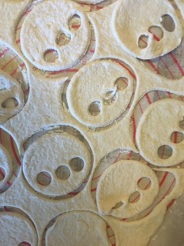 Peste piureul de mar punem apa și drojdia. Lăsam 5 minute sa se activeze, apoi punem 2 Cupe de faina, iar restul treptat. Poate nu va fi necesar sa puneti toată faina sau poate va trebui sa suplimentați. Se întâmpla asta in funcție de cât de mare a fost marul și cât de umeda este faina. Însă, trebuie sa știți ca aluatul va rămâne lipicios. Îl frământați 5-7 minute și puneti și uleiul. Lăsați la odihnit 15-20 minute. Nu ne dorim sa crească mult aluatul. Puneti aluatul pr blatul de lucru tapetat cu faina, presărați faina și întindeti intr-o foaie subțire. Unde se lipește, mai presărați faina. Pe blat in permanenta va fi faina. Amestecați și puneti câte o felie de mar oe semicercul fără găurele, apoi lipiți cercul, conform pozelor. Ungeți plăcintelele cu uleiul rămas in castronul in care au fost merele. Băgați tava la cuptor la 180 de grade pentru 30 de minute. Delicioase. Băiețelul meu a mâncat doua imediat cum le-am scos din cuptor.